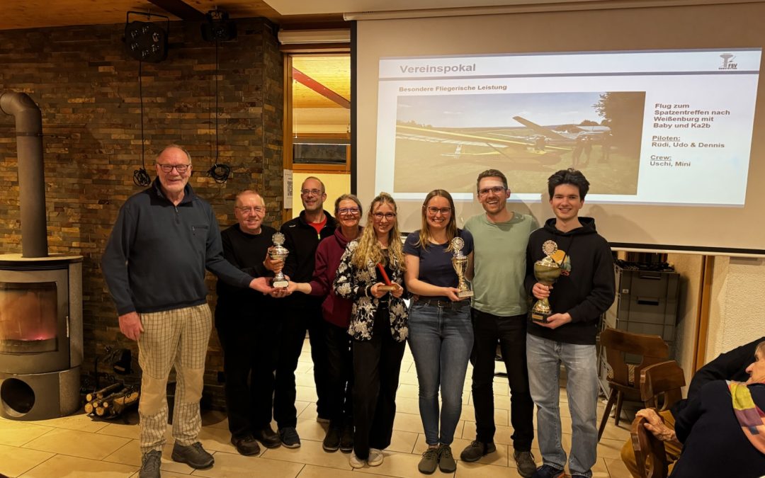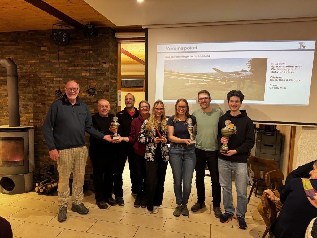 Der Vereinspokal wurde dieses Jahr erstmalig statt für die punkthöchste Strecke gesamt im Verein für besondere fliegerische Leistungen vergeben. Für diese Kategorie kamen also viele Flüge in Frage, unter anderem ein Flug an die Ostsee, ein Teamflug am Monte Viso, Fliegen über Balaton und Budapest und viele mehr. Als Sieger gekürt wurde schließlich der Flug mit dem Grunau-Baby und der K2 nach Weißenburg zum Spatzentreffen. Die Verleihung des Pokals an die gesamte Mannschaft dieses Tages, die Piloten Rüdiger Benz, Udo Ruppender und Dennis Haag sowie die Rückholcrew Ursula Benz und Michael Berlec, zeigt ganz klar, dass nicht nur das Fliegen alleine sondern auch die meist unsichtbaren Unterstützer und Helfer für besondere fliegerische Erlebnisse essentiell sind.